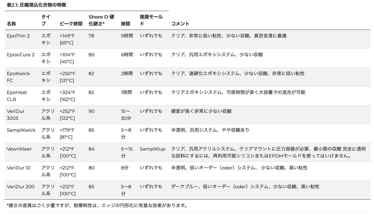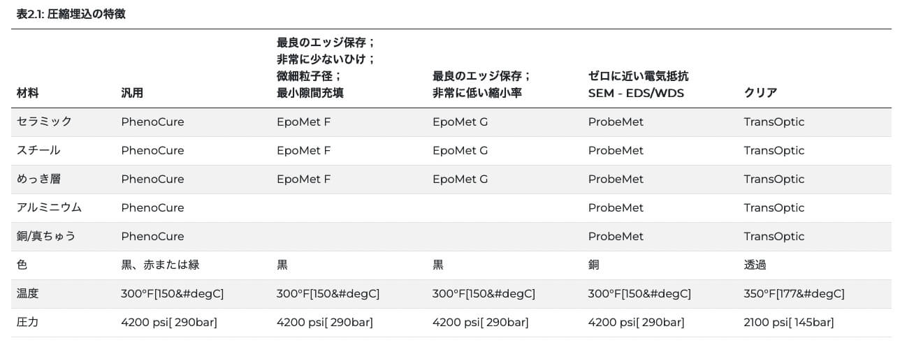 最も一般的な金属組織学的埋込方法で、圧力と熱を使い熱硬化性または熱可塑性の埋込材料で試料を封入します。熱硬化性化合物には、フェノール性(PhenoCure)、フタル酸ジアリル、エポキシ(EpoMet)などがあり、熱可塑性埋込化合物で一番よく使われるのがメタクリル酸メチル(TransOptic)です。表2.1 圧縮埋込化合物の特徴。
